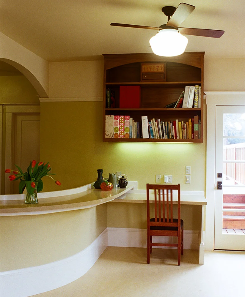 A small Arts & Crafts Bungalow and a growing family needed more living space and an updated Kitchen. The family loved their Albany bungalow, but the cramped Kitchen had little original character, the fireplace had been bricked over, and the basement office was barely legal. The result of their remodel is a generous Kitchen with improved backyard access and a cozy downstairs Family Room complete with a new direct-vent fireplace.