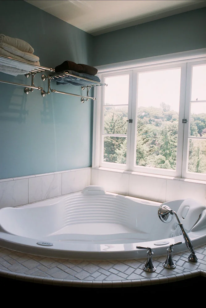 The room was designed for generous amounts of natural light and features an octagon window typical for homes of this vintage. A variety of light fixtures were selected for functionality: wall sconces grace the sink area, a fluorescent fixture provides general lighting while the wall towel racks are accented with a recessed wall washer.