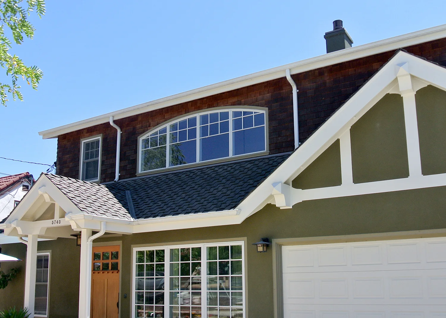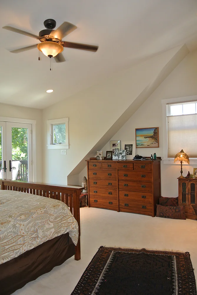 This tired, 1950's suburban tract house was too small for its grand piano. It not only needed a master suite, it needed general remodeling. On the main floor, the living, dining, and kitchen rooms were remodeled while on the upper floor, a master suite was created – including a deck – with a larger dormer roof. Existing bedrooms were enlarged, an office was added, and all upstair rooms take advantage of wonderful foothill views.